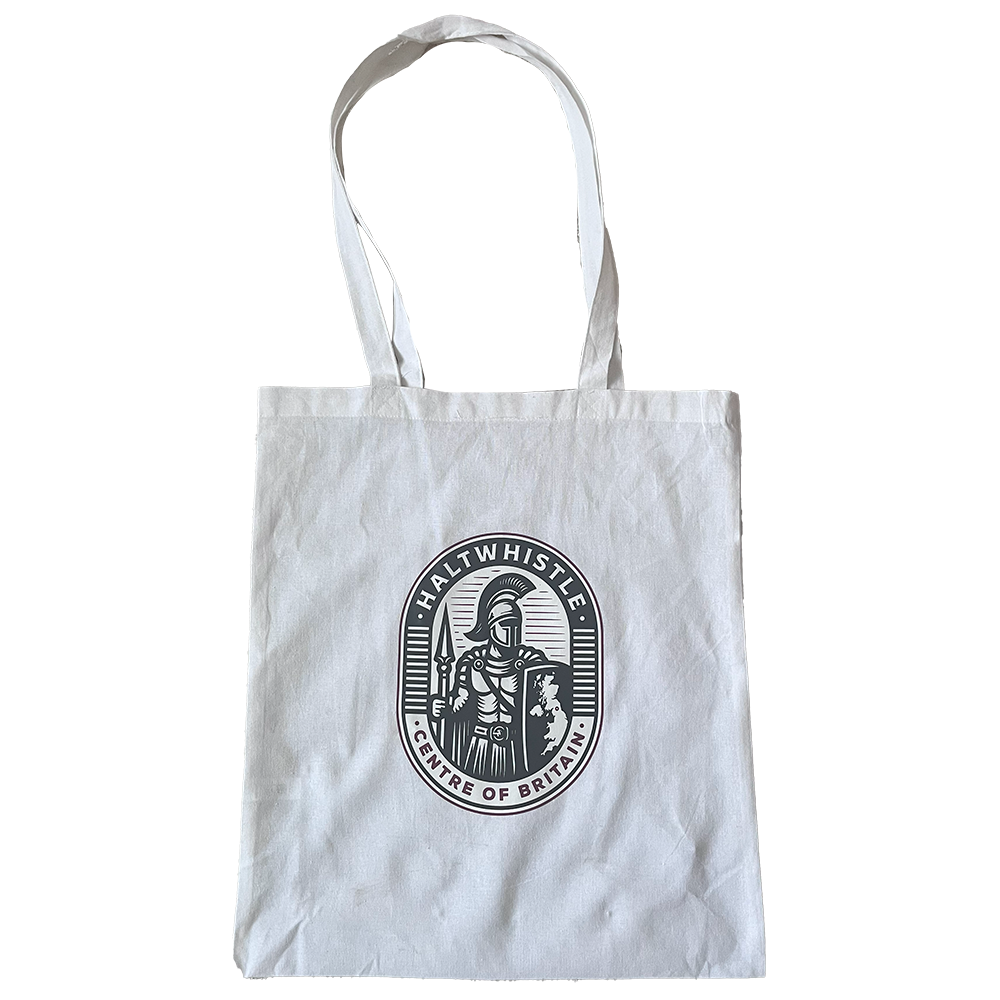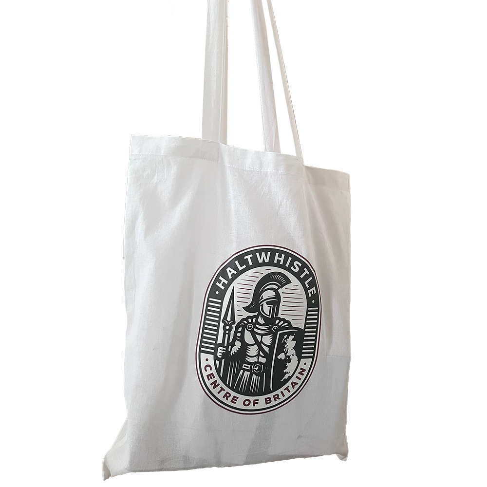 White, long handled cotton tote bag with Haltwhistle Centre of Britain logo.