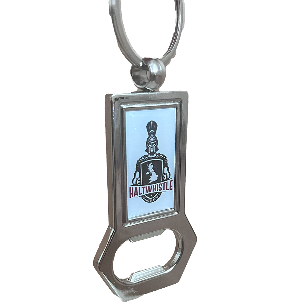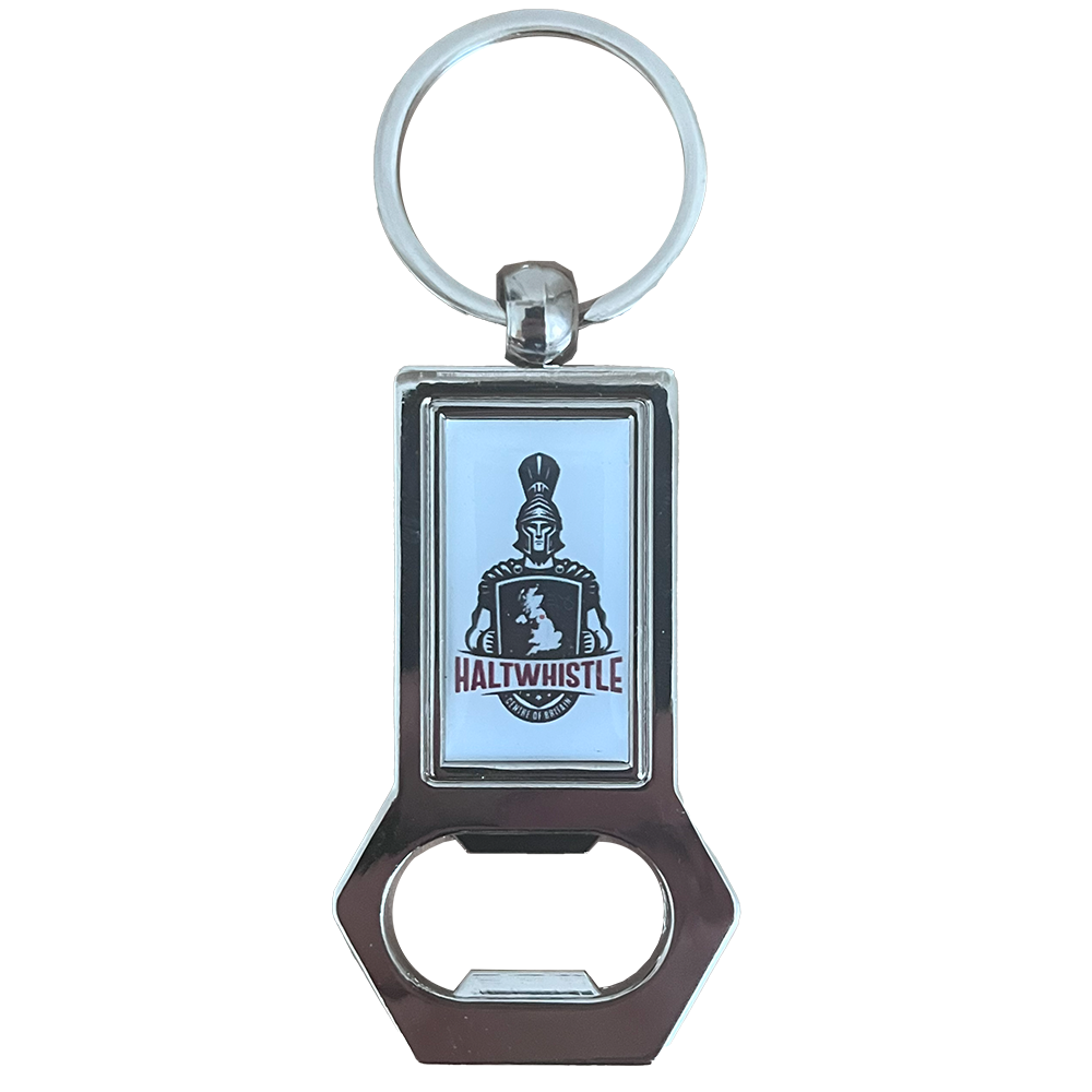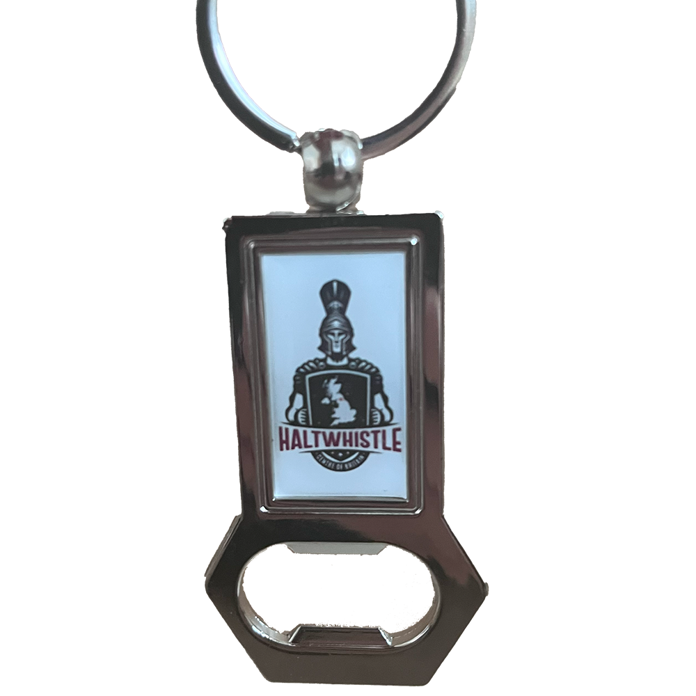 Haltwhistle Centre of Britain bottle opener keychain, made with a durable alloy.